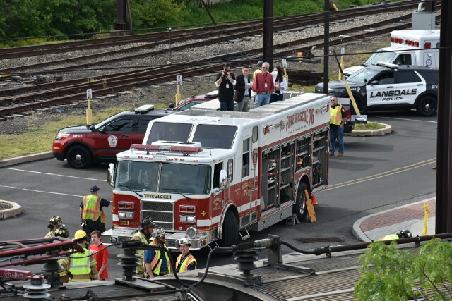 | On the station side, a fire-rescue vehicle from Towamencin was used as a platform for observers. |