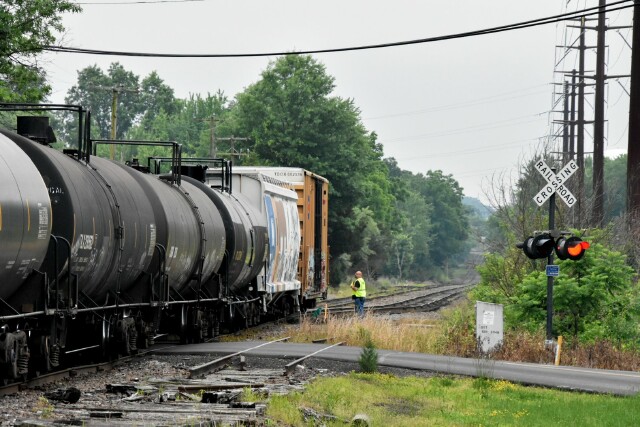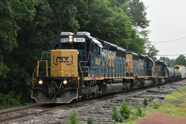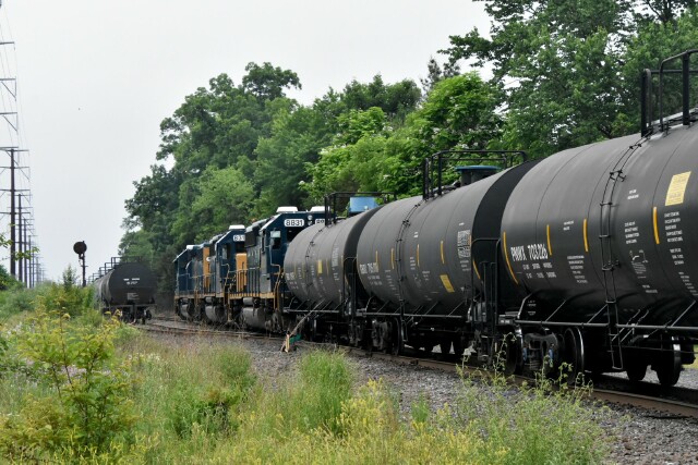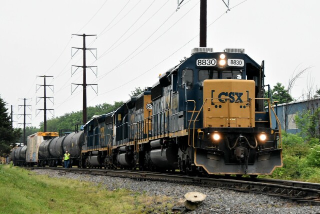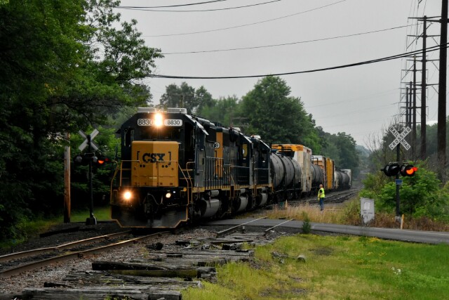 | CSX L042 has just come into Lansdale on the Bethlehem Industrial track, has cleared the Stony Creek Branch and CP Dale on SEPTA and is now on the Bethlehem Branch on the Bethlehem Running track, passing the yard and approaching the grade crossing at Cannon Avenue in Landale PA |