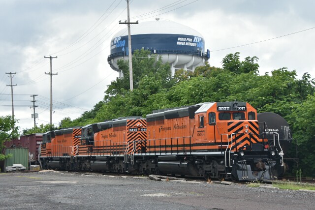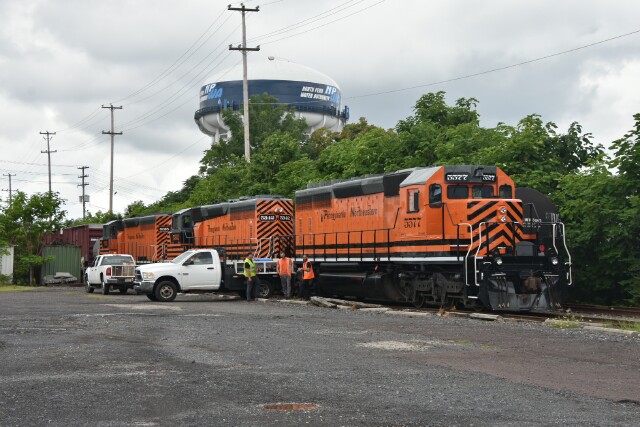 | Tuesdays and Thursdays are light days for the Pennsylvania Northeastern crews, as CSX L042 has cleared out the outbounds just after midnight and the previous day's L160 took care of the inbounds. So it is a chance to catch up on other important details like equipment and track maintenance. July 23 2024 finds all three Tigers out near Cannon Avenue getting some TLC. |