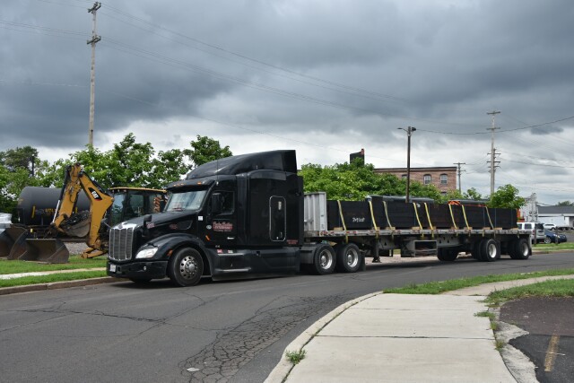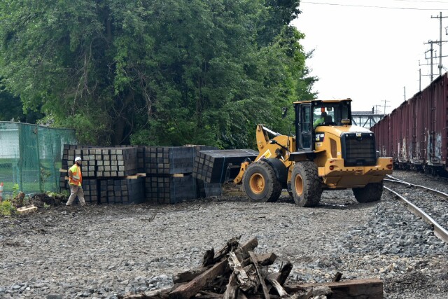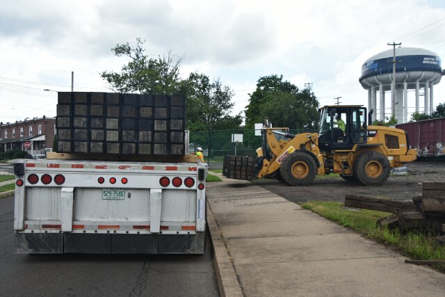 | On the track maintenance side, a truckload of new ties arrives at Fifth Street. |