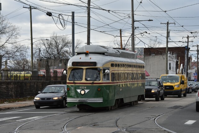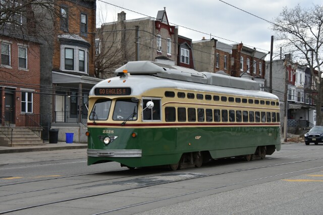 | After shooting the east end of SEPTA's Route 15, I moved to the west end. Here is PCC III 2328 on Girard Avenue between 41st and 42nd Streets. |