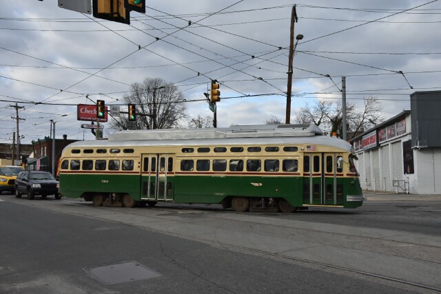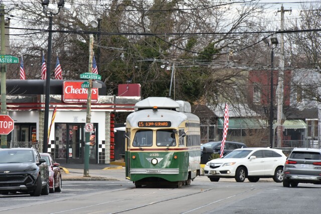 | My ultimate destination was the intersection of Lancaster and Girard Avenue in West Philadelphia, where the 10 and 15 cross. PCC III 2326 swings off the short dog leg on Lancaster Avenue before it continues west on Girard. |