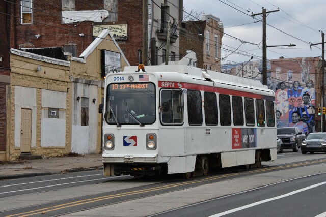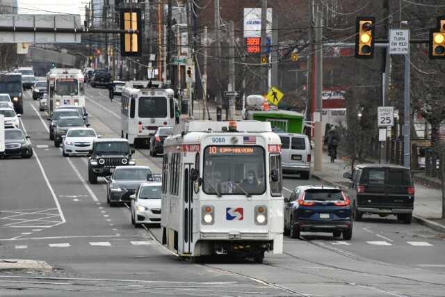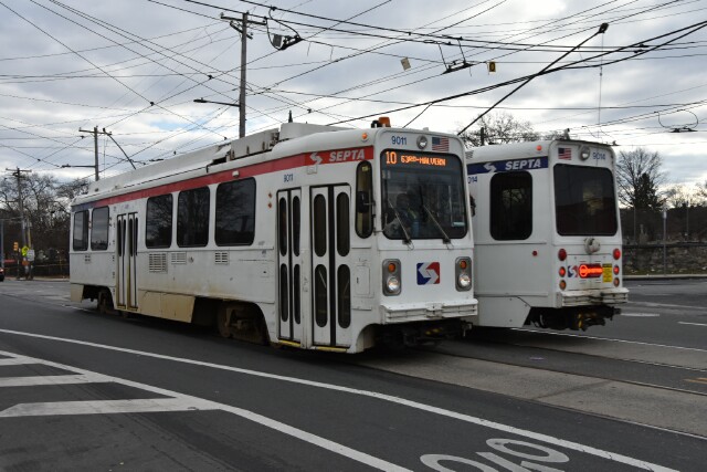 | Route 10 runs most of its miles on Lancaster Avenue which affords many meet possibilities, like 9014 passing 9011. |