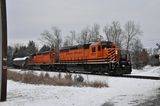| After cutting off the car, the power, SD40-2 PN 5577 and SD40-2W PN 5315, heads back to the yard, here between Orvilla and Schwab Roads ... |