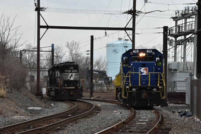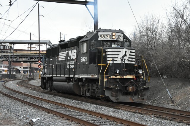 | February 5 2025 finds NS H82 out of Abrams Yard waiting at CP Kalb in Norristown PA with GP38-3 NS 5821. |