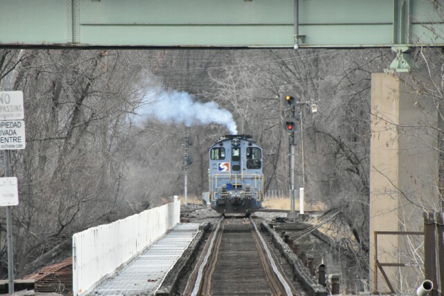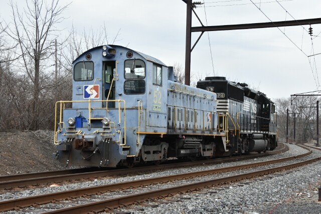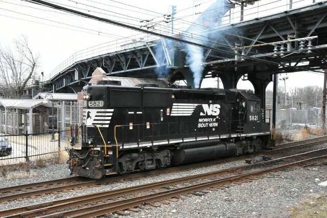 | After Extra 70 dropped off SW1200 SPAX now KLWX 52, it was time for the reaper to move in, and it was fitting that it was dressed in black. NS H82 powered by GP38-3 NS 5821 got the signal at CP Kalb, passing under SEPTA Norristown High Speed Line. |
