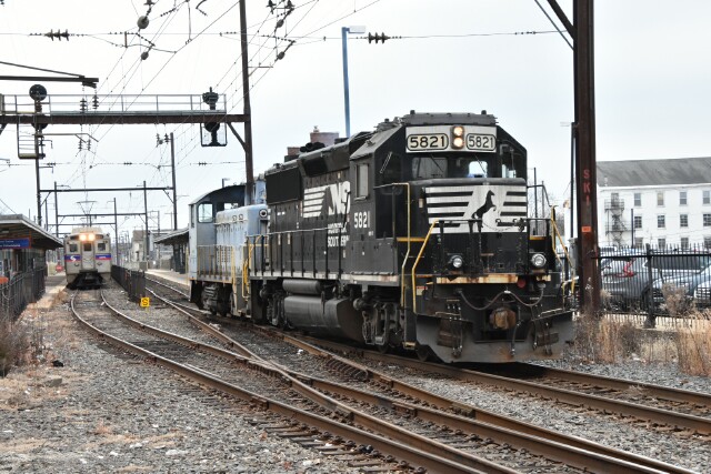 | After coupling up, NS H82 departed the station just as an outbound SEPTA train made a stop. |