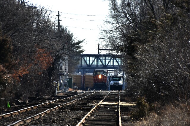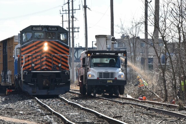 | February 10 2010 Pennsylvania Northeastern Railroad Bethlehem Branch local L160 with SD40-2W PN 5313 and GP39-2 NHRR 901 working the yard as usual, but this time with competition for the railroad as a tree clearing crew has been brought in to do some trimming. |