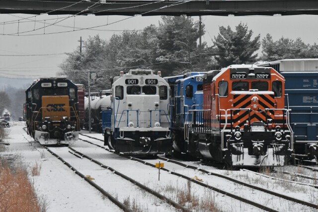 | February 12 2025 A dusting of snow covered the area as CSX L042 power rests in the yard with PN and NHRR engines. |