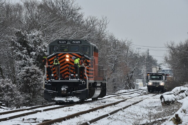 | SD40-2W PN 5315 shuttles a crew of maintainers to clear the switches along the line. |