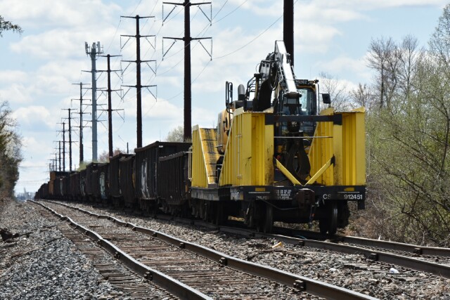 | April 8 2025 Spring has sprung and it is maintenance season, and CSX prepares to do some work on their half of the Stony Creek Branch. First, we are gonna need ties, lots and lots of ties, so CSX L042 brought in a string of MOW gondolas filled with them, dropping them off between Orvilla and Vine. |