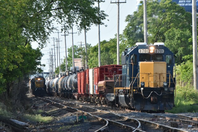 | June 2 2025 CSX L042 had been arriving in Lansdale in the mid-morning lately, so it was not a surprise to eventually see PN L160 work the branch at the same time. PN L160 was spotting some tank cars in storage as well as a cut of MOW cars on the industrial track while L042 comes up the runner. |