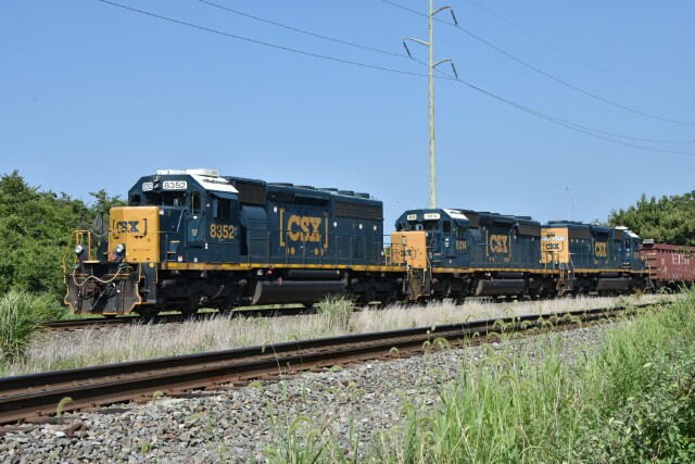 | The cars at the front half of the train were the Herzog ballast cars in preparation for CSX's future tie and surfacing work on their half of the Stony Creek Branch. |