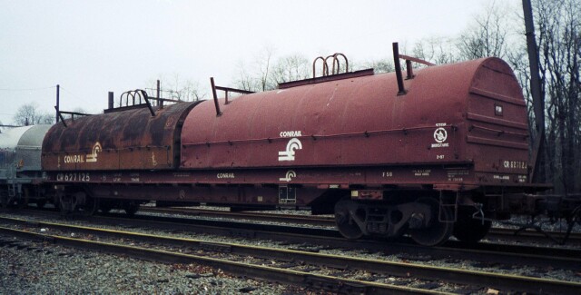 | Conrail coil steel flat car Class F50 CR 627125 (ex-PC 752125) with round hoods Morrisville PA December 1999 |