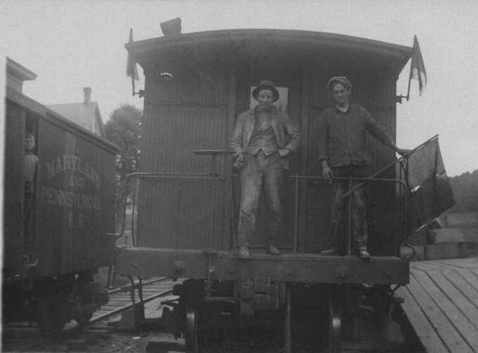 mapacars.jpg - Ma & Pa boxcar and caboose, possibly at Brogueville, Pennsylvania
