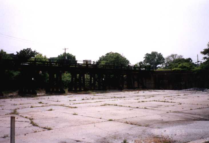 | In the area of Arch Street and Loucks Mill Road, near the end of what was previously the Western Maryland Railway, standing this old wooden coal trestle. It appears as though there was once a second trestle at this site. Occasionally you would find a small covered hopper spotted on this trestle, but I haven't seen any spotted here recently. I realize this isn't the best photograph ... I hope to get a better photo in the future. |