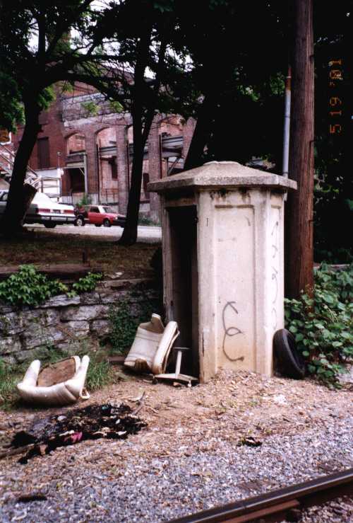 | I just found this structure this past spring during a fire response. This switchman's shanty stands along the old Northern Central's right-of-way between King and Princess Streets in downtown York. It's a little worse for wear, and it seems as though it is a popular dumping place.