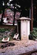| Around the corner from the big Northern Central station is the old Western Maryland freight station. It is located on North George Street at Arch Street. This building was recently rehabbed as part of a George Street beautification project. The old Western Maryland sign was repainted on the side of the building, with the addition of "Yorkrail, Inc." on the sign, whose trackage now abuts the building, now used as a grain transfer facility. It the background, a truck is loaded with grain from a covered hopper car. Across the street was the location of the Western Maryland's passenger station, long since gone. |