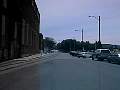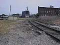Now we're looking south from essentially the same location. Here you see the tracks entering the street, and heading south. Philadelphia Street crosses at the intersection. The building on the left was originally a steam plant that generated electricity, and sold the steam to downtown buildings for heat. It has since been converted into a commercial/industrial complex with different businesses, including a switching station for MCI. Sadly, no one in the complex is using any rail service. |