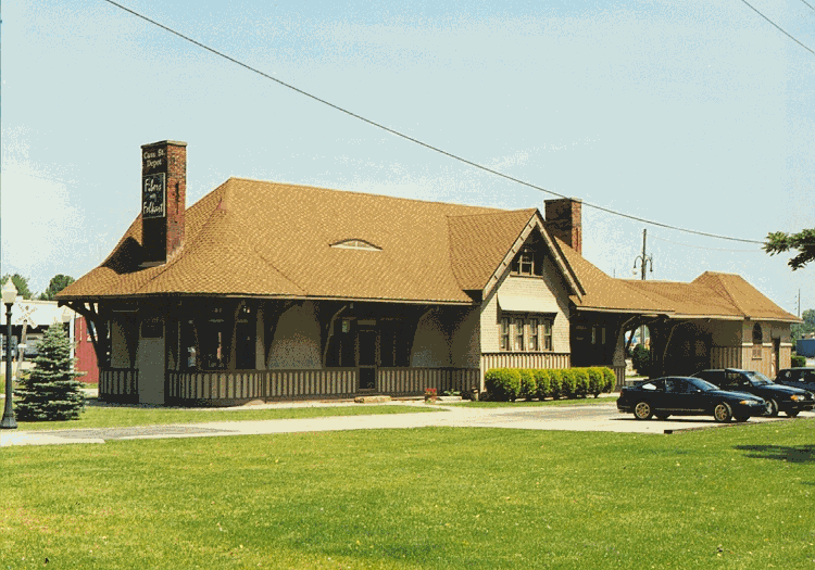 Ft. Wayne, Indiana The Lake Shore and Michigan Southern Railroad constructed a number of classic passenger stations. Many of these architectural gems exist today. Among these is a remarkable survivor of the high Victorian, Queen Anne style, Fort Wayne, Indiana. Built in 1889, on a branchline of the railroad, the LS&MS station sits across the St. Mary’s river from downtown Fort Wayne. The city was served by several railroads. The Wabash, New York, Chicago and St. Louis (Nickel Plate) and Pennsylvania RR all had mainlines through the city. Cass St., as it is known locally was even a union station of sorts for several years, acting as a train change point for service from Cincinnati and Louisville to the east-west services of the LS&MS. Absorbed by New York Central in 1869, the Lake Shore’s station assumed a secondary status as the east - west mainline of the Central was located further north through Waterloo. But like hundreds of other NYC stations not on the mainline, it was a part of the greater corporate empire of the Water Level Route. The large wood frame depot is highlighted by shingled rounded roofs, eyebrow dormer windows and two large brick chimneys. Each of the station’s two waiting rooms had large fireplaces. An express building in the same style as the station proper adjoins the shelter canopy at one end. Passenger train service lasted until about 1940. Today the station houses a local sewing and craft business. The park like setting overlooks the river and downtown skyline beyond. Trackage was still in existence although it appeared very rusty during our visit of June 1999.