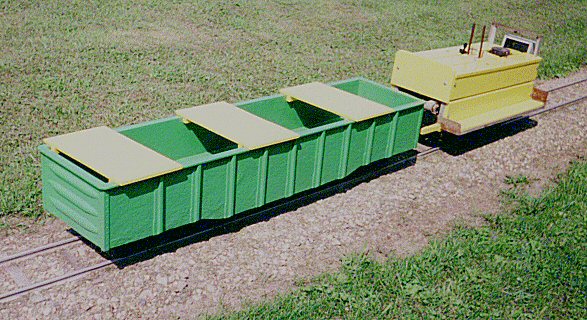 The beginning rolling stock is a Farimont Speeder and Gondola Car. The initial trackage was layed out as a Boy Scout Railroad Merit Badge project for my Scout Troop in '98. It was an oval measuring 40' x 65' using full profile aluminum rail set on 2 x 2 crossties. I didn't know much then (and still wonder today)