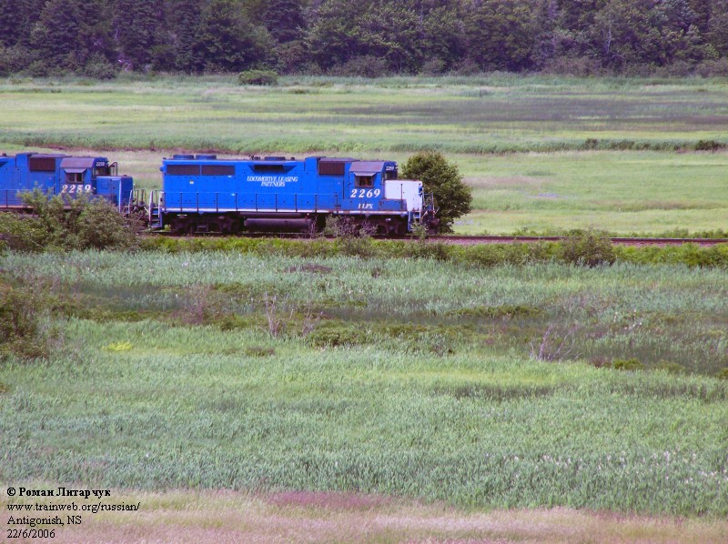 LLPX 2269 and sister LLPX 2259 emerge from the bushes. The units blue color seems to go with the greenish scenery rather well, even though no water or sky is present in the photograph to complement the blue color. Note that 2259's door is open.