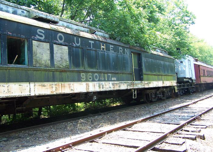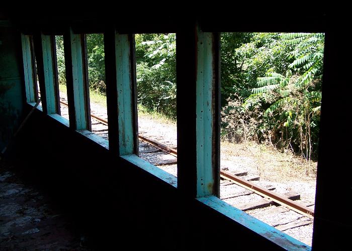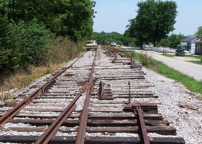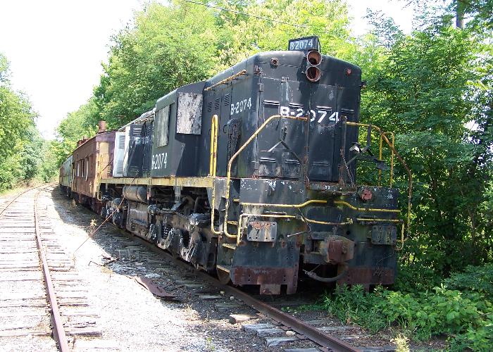 Milner, Kentucky The abandoned line from Tyrone, running past Milner, contains a siding with an old diesel loco and variety of rolling stock. I presume they belong to the railroad museum east of Milner. Evidence shows that this train is haunted for the benefit of youngsters each Halloween. |