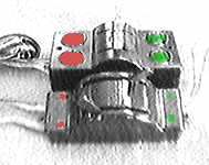 | The American Flyer 720 remote switch was produced from 1946 to 1949. The 720a was introduced in 1949. It was produced till 1956. The switches differed in base, motor and lamp cover. There was a V notch in the base between the straight rails and the curved rails just in front of the 2 train button, there was a long motor housing in back of the binding posts, and the lamp cover was round from side to side, and that square area was more shallow as the motor was not under the lamp assembly. | ![]() |