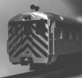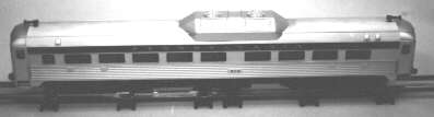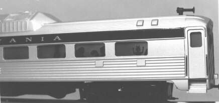The shell is styrene plastic formed from sheets of Evergreen and Plastruct shapes.The roof vent fans are from a mold I made of AM's Amtrak diesel and cast in resin. There's very little filler in it's construction. The colors are Floquil's Old Silver with Tuscan striping. The lettering is Microscale Pennsy yellow with heralds from the same sheet. The thing will run on AC or DC and has constant interior lighting from a circuit I found in a magazine. |