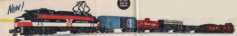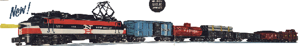 499/21571 New Haven (GE) Electric Locomotive 985/24043 Boston & Maine Box 958/24316 Mobilgas Tank Car 911/24109 Chesapeake & Ohio Gondola 920 Southern Gondola 921/24206 C B & Q Hopper car 935/24619 New Modern Railroad DeLuxe Caboose |