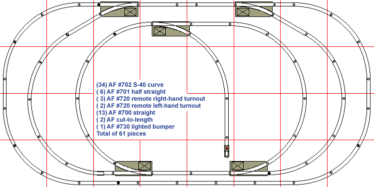 Brian Johns wrote: "Attached are two more GIFs of the layout I've actually got set up on my 4x8 table right now. I wanted to smell some AF smoke again <grin> so have put this together until I assemble all the pieces and stuff I need for a two-level layout. This layout is a variation on the "Suggested Track Layout #9" found in almost any of the AF paper. "