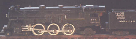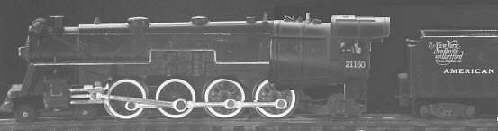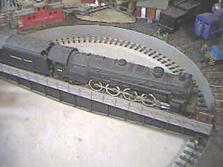 Here's of Chuck Smith's "kitbashed" AF 4-8-2, sitting on the Chemung Valley Lines turntable. It is a 293 Pacific boiler with an Atlantic cab and firebox and spliced driver chassis. A little bit of valve gear linkage was added. It's painted hot rod gray primer and lettered for the CVL. |