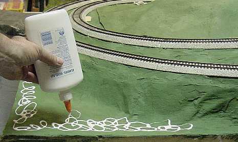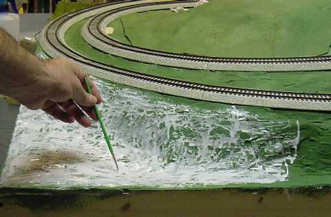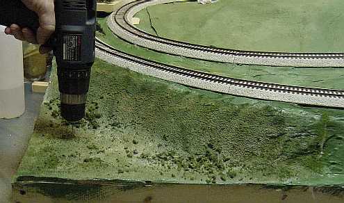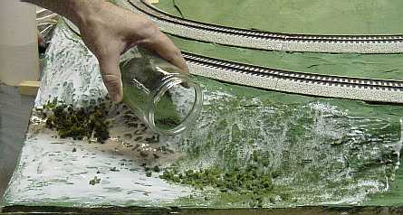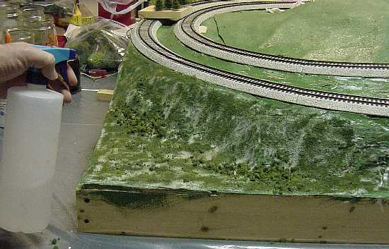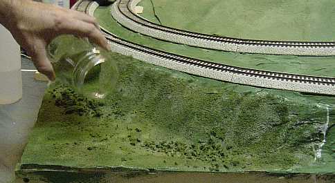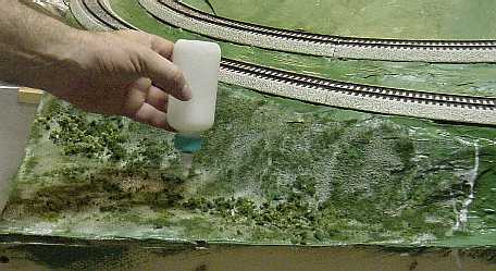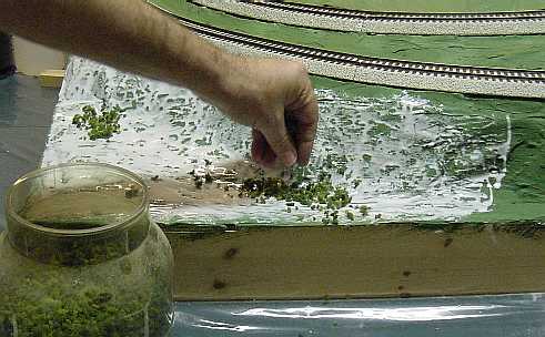 To further unify the scenery, a 4 to 1 , water/glue mixture is 'dropped' onto the scenery. |