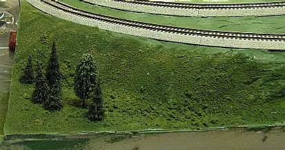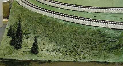| With most of the trees in place the corner is almost finished. The wet glue is still visible through the scenery. | ![]() |