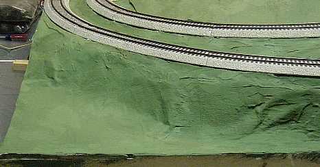 At the onset I must confess that I have no experience in this type of scenery. Bill Porter was generous enough to make the one hour trip to my home to instruct me in the fine art of scenery. He also supplied most of the supplies. Thanks Bill! This is one corner of my portable layout. It is joint compound on paper, on top of plywood and 1x2 supports. At this point it has been painted with latex paint, in a camouflage pattern, using several shades of green. The paint has been allowed to completely dry. |