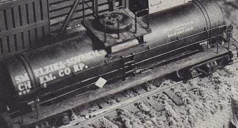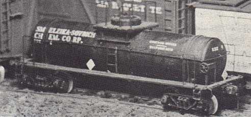 Photo: Smelzika-Sovbieh Chemical Corp. tank ear #4 stands in Canfield Yard while enroute to firm's fertilizer works at Grafton on the Canfield & Northern Railroad. Car is freelance, converted from an HO kit, but very similar to real 3,000-gallon tank cars. Couplers are Roundhouse HO knuckle couplers, side-operated by lever. Rail is code 70. |