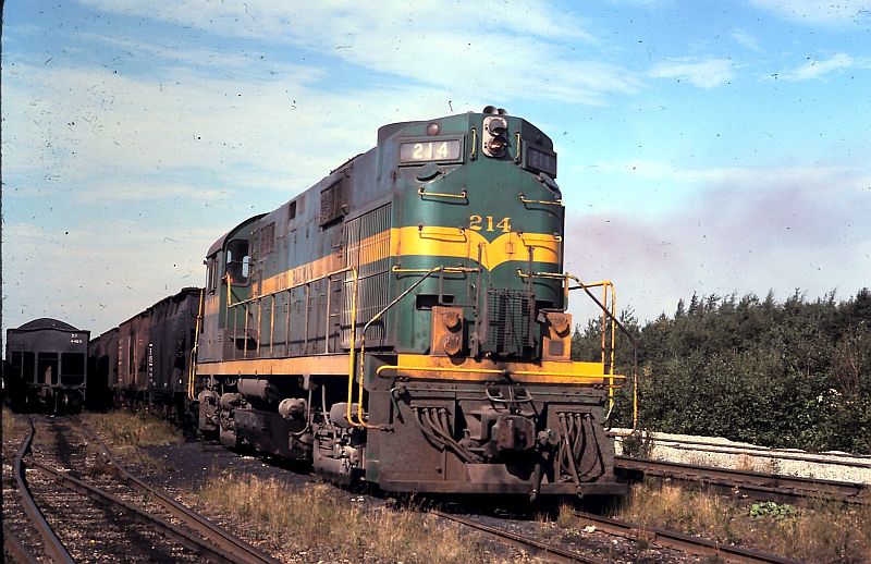 Devco Railway RS-27 #214 is seen passing the Victoria Junction office on August 31st, 1978. 214 & 215, built in 1959, were the original ALCo demonstrator units for the RS-27 and were both acquired in 1975. Both units were retired and scrapped in 1984.>(Collection of K. Jones Jr.)