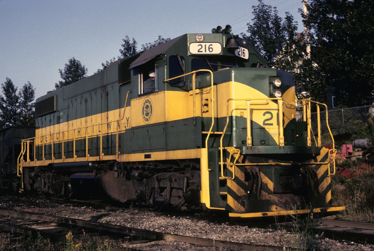 Devco Railway GP38-2 #216 is coupled up to a hopper at the Glace Bay Shop. 216 was built in 1979 by GMD and was one of four units equipped with external power connections for emergency power at the mines. The locomotive was sold to New Brunswich Southern in 2003 and became #2318.>(Collection of K. Jones Jr.)