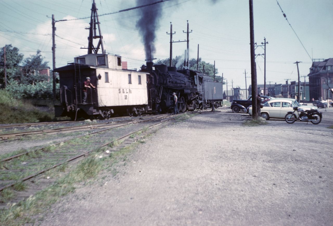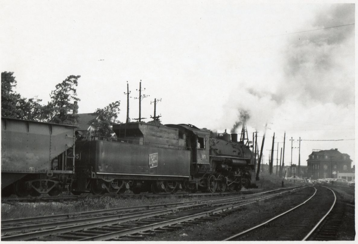 Sydney & Louisburg 0-8-0 #85 has passed the photographer on its way out of the Glace Bay yard with a string of empty hoppers on July 21, 1960. This view is looking north towards Main St. The Glace Bay Town Hall is visible in the photo. #85 was originally owned by the Wabash Railway, class C-4.>(Collection of K. Jones Jr.)