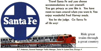 The portion of the Santa Fe represented is double track main line. There is a branch line that was once the Santa Fe mainline and a connection with the Rio Grande to Denver. The branch line is still a source of revenue with a working chromite mine and a major year-around resort, reached only by rail. A modern Athearn RDC set that is used for supplies and employees serves the resort. The tourists arrive on an old steam train with vintage coaches. Other supplies for the resort and the servicing of the train and locomotive arrive by a local as needed.