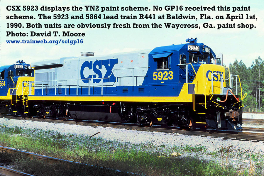 - CSX YN2 – No GP16’s were painted in this scheme. CSX adopted the YN2 Paint scheme in March 1990. Some of the first units to receive this scheme were CSX B36-7’s 5864, 5895 and 5923. CSX YN2 Paint sample.