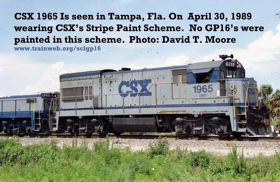 - CSX Stripe Paint Scheme – No GP16’s were painted in this scheme. This scheme was applied from about April 1986 – October 1987. The first applications in April of 1986 included the words Transportation on the long hood. The 5508, a GE B30-7, actually had the word Transportation on the sides of the long hood and nose and rear for a short time. Sample of CSX Stripe Scheme
