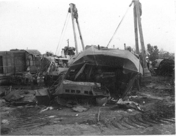 torn loose, and the trucks and fuel tank were completely ripped off.