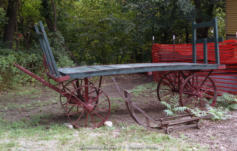 Otoe (now located in Nebraska City), Nebraska - two baggage carts on display with the restored Otoe depot; August 2002 - T. Greuter Photo · |