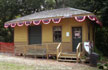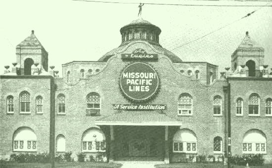 Town's Meeting Hall The earliest structures were humble, usually single story wood buildings. In larger towns these would become imposing multi-story structures, with spires and elaborate trim, meant to impress and show the railroad's importance to it's citizens. Typical depot colors on the early MoP were colonial yellow (almost a light lemon color) with medium green trim. It's been stated that the railroad used light yellow so engineers could see the depot at a distance. The MoPac changed from green to brown trim after 1925. In later years the large buildings gave way to smaller, more utilitarian in design. The MoPac adopted all white paint for it's wooden depots. Brick stations had white trim. Finally, many depots met their end through fire, mishaps, or demolition, being replaced by frieght offices. Eventually even these disappeared.