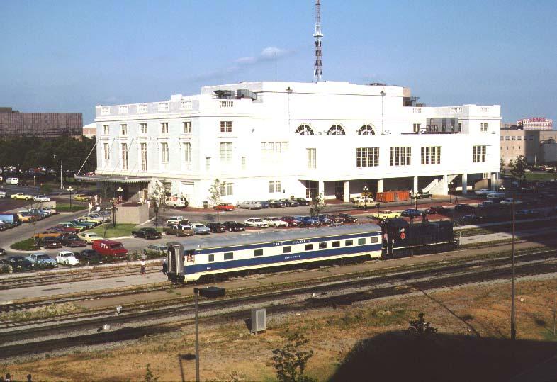 Dallas, Texas - Missouri Pacific switcher with MP bedroom-lounge Eagle Cliff at Dallas Union Station; June '80 - © Gary Morris Photo |
