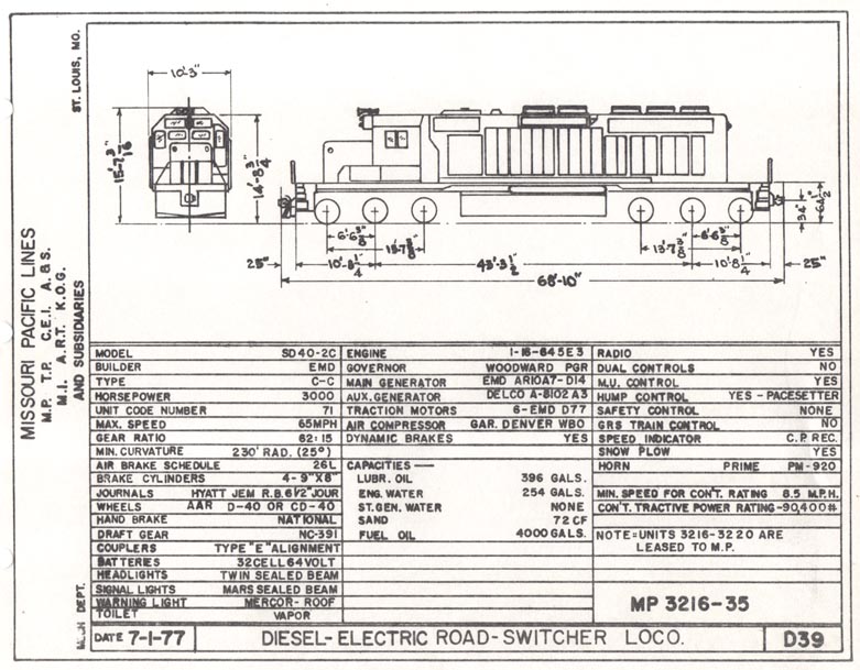MP SD40-2 #3216-35 - diagram dated 7/1/77 - Missouri Pacific Diagram/Daryl Favignano Collection |