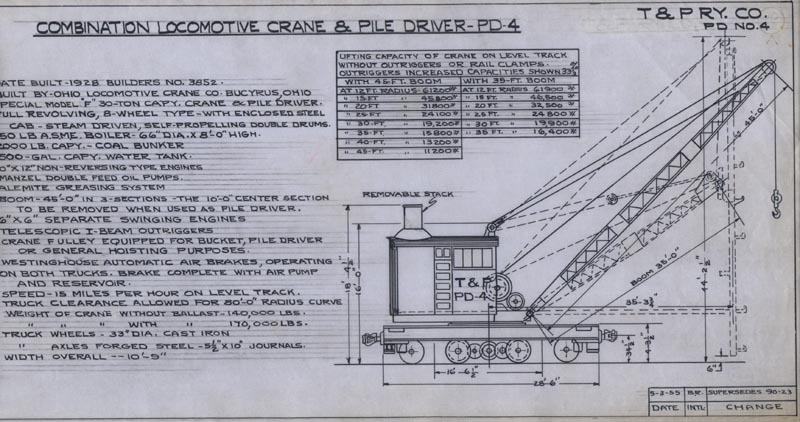 T&P Locomotive Crane & Pile Driver #PD 4 - diagram dated 5/3/55 - Missouri Pacific Diagram/Daryl Favignano Collection |