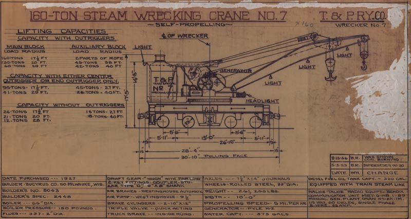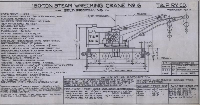 T&P 150-Ton Steam Wrecking Crane #6/X-160 - diagram dated 8/15/56 - Missouri Pacific Diagram/Daryl Favignano Collection |
