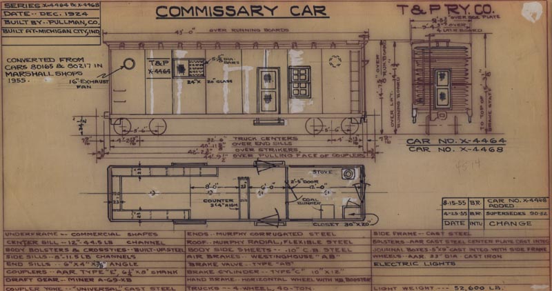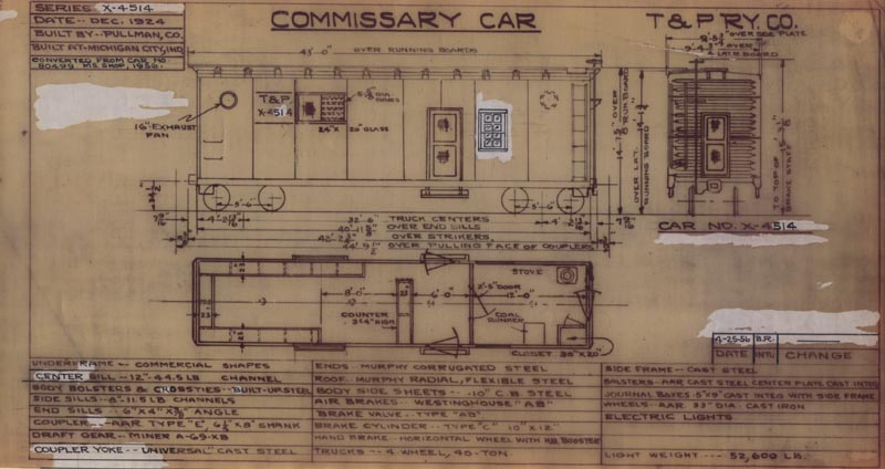 T&P Commissary Car #X-4514 - diagram dated 4/25/56; converted from boxcar (blt. 1924) in 1956 - Missouri Pacific Diagram/Daryl Favignano Collection |